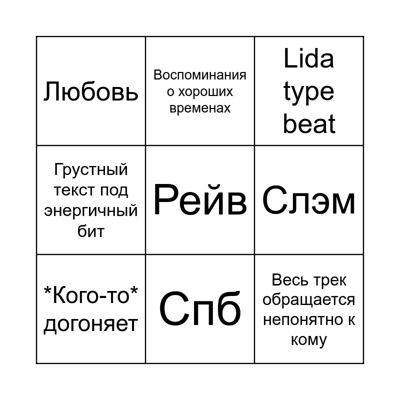 This bingo card has a free space and 8 words: Слэм, Lida type beat, Воспоминания о хороших временах, *Кого-то* догоняет, Любовь, Весь трек обращается непонятно к кому, Грустный текст под энергичный бит and Спб.