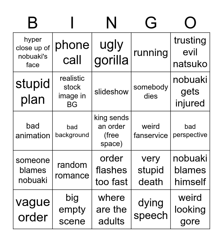 This bingo card has a free space and 28 words: nobuaki blames himself, nobuaki cries, somebody dies, dying speech, stupid plan, ugly gorilla, phone call, someone blames nobuaki, weird fanservice, vague order, bad animation, running, big empty scene, where are the adults, nobuaki gets injured, girl screams, random romance, realistic stock image in BG, slideshow, order flashes too fast, hyper close up of nobuaki's face, mamoru miyano voice acting, weird looking gore, bad background, bad perspective, very stupid death, trusting evil natsuko and suddenly crazy.