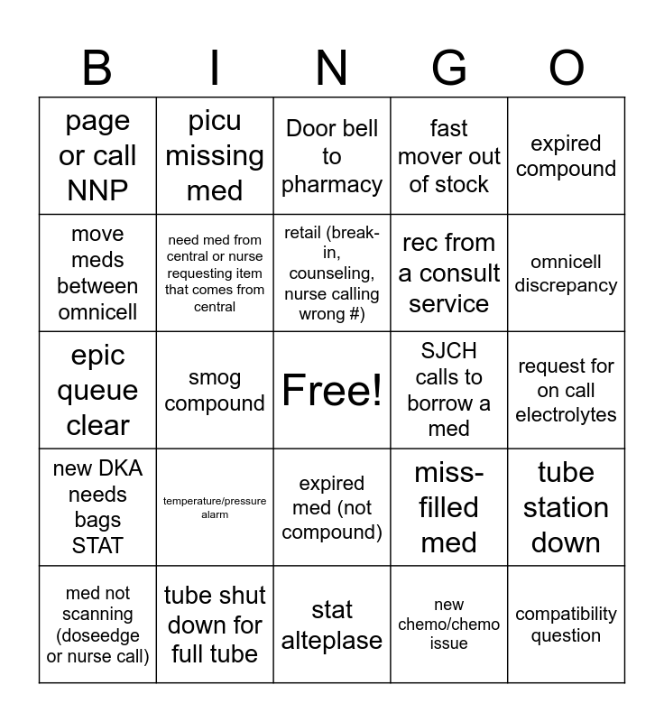 This bingo card has a free space and 49 words: weird/inappropriate item in return bin, compatibility question, TPN issue, stat alteplase, temperature/pressure alarm, code response needed, picu missing med, nurse has <1 hour on a drip, move meds between omnicell, med request for order put in <10 min ago, need med from central or nurse requesting item that comes from central, fast mover out of stock, tube station down, miss-filled med, page on call, request for med to be tubed on do not tube list, retail (break-in, counseling, nurse calling wrong #), SJCH calls to borrow a med, med message requesting drug in omnicell, expired compound, smog compound, new chemo/chemo issue, page or call NNP, rec from a consult service, med sent secure returns in tube, omnicell discrepancy, med not scanning (doseedge or nurse call), trauma B/stab code/OB c-section, expired med (not compound), new DKA needs bags STAT, doseedge bypass, brand new TPN, new LOS/EOS orders, call from outside pharm to borrow med, tube shut down for full tube, request for vfc vaccine, recon med, status board clear, request for on call electrolytes, omnicell issue, med message requesting med scanned into med bin, phone call from MD needing dose recommendation, med stored improperly, nurse calls and asks for med to be approved, epic queue clear, Door bell to pharmacy, IV room calls out for stock, DE rework and need to waste for a narc.