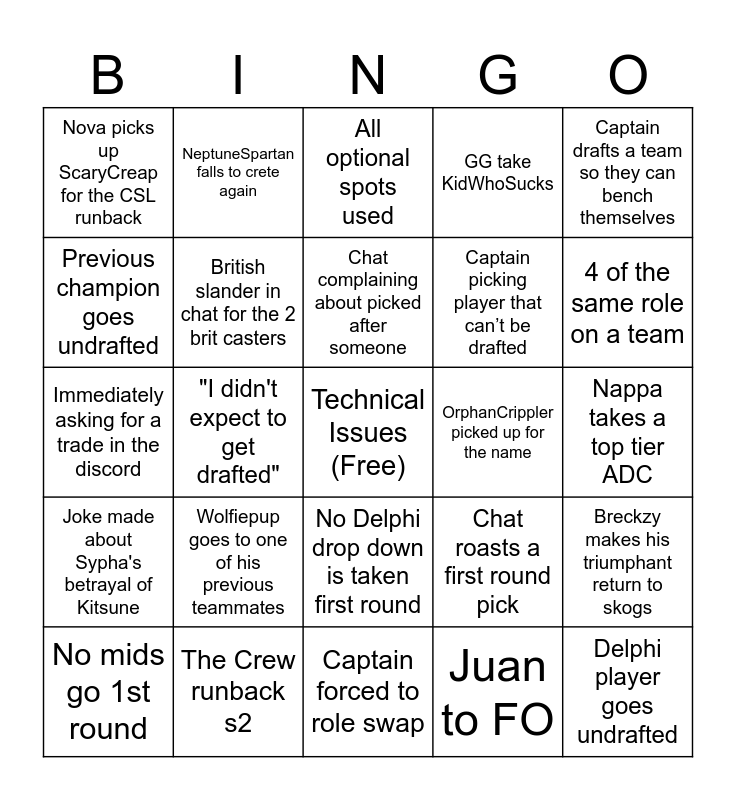 This bingo card has a free space and 24 words: No mids go 1st round, Wolfiepup goes to one of his previous teammates, Chat complaining about picked after someone, Juan to FO, Captain drafts a team so they can bench themselves, Nova picks up ScaryCreap for the CSL runback, NeptuneSpartan falls to crete again, All optional spots used, OrphanCrippler picked up for the name, Nappa takes a top tier ADC, Immediately asking for a trade in the discord, British slander in chat for the 2 brit casters, Chat roasts a first round pick, Breckzy makes his triumphant return to skogs, Previous champion goes undrafted, The Crew runback s2, Captain forced to role swap, GG take KidWhoSucks, 4 of the same role on a team, Joke made about Sypha's betrayal of Kitsune, "I didn't expect to get drafted", No Delphi drop down is taken first round, Captain picking player that can’t be drafted and Delphi player goes undrafted.