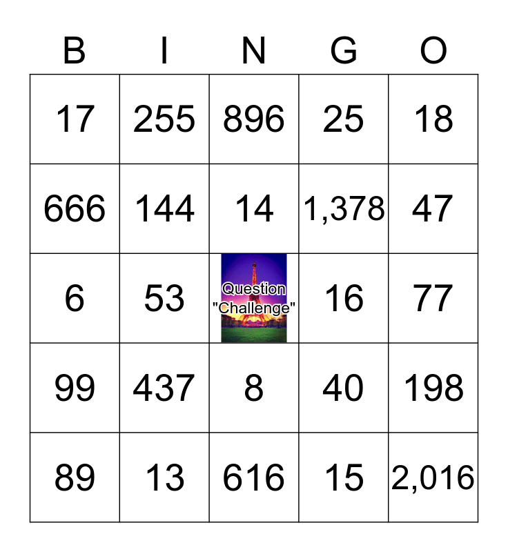 This bingo card has a free space and 24 words: 437, 13, 14, 89, 18, 17, 666, 255, 16, 8, 1,378, 6, 40, 198, 144, 15, 77, 896, 47, 53, 2,016, 99, 25 and 616.