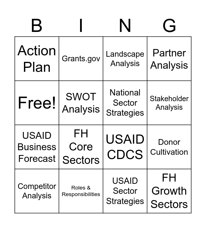 This bingo card has 16 words: Roles & Responsibilities, Donor Cultivation, Landscape Analysis, Action Plan, USAID Business Forecast, Grants.gov, USAID CDCS, USAID Sector Strategies, Free!, SWOT Analysis, Competitor Analysis, Partner Analysis, FH Core Sectors, Stakeholder Analysis, National Sector Strategies and FH Growth Sectors.