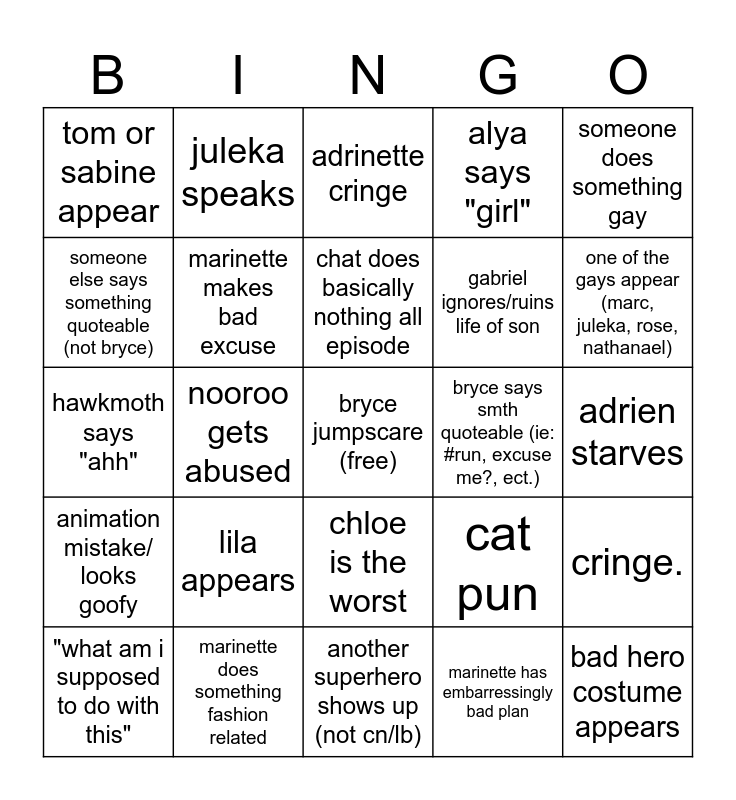 This bingo card has a free space and 36 words: transformation in plain sight, Luka appears, believes someone else over marinette, marinette makes bad excuse, cat pun, animation mistake/ looks goofy, chat does basically nothing all episode, hero guesses where akumatized object is first try, someone does something gay, plagg mentions cheese, nooroo gets abused, alya says "girl", marinette is clumsy, bryce says smth quoteable (ie: #run, excuse me?, ect.), one of the gays appear (marc, juleka, rose, nathanael), tom or sabine appear, cataclysm misses, lila appears, bad hero costume appears, adrinette cringe, adrien starves, cringe., marinette does something fashion related, "what am i supposed to do with this", another superhero shows up (not cn/lb), juleka speaks, hawkmoth says "ahh", chloe causes akumatization, gabriel ignores/ruins life of son, someone else says something quoteable (not bryce), autism moment, fashion crime, marinette has embarressingly bad plan, chloe is the worst, ladynoir moment and why is this in a childrens tv show???.
