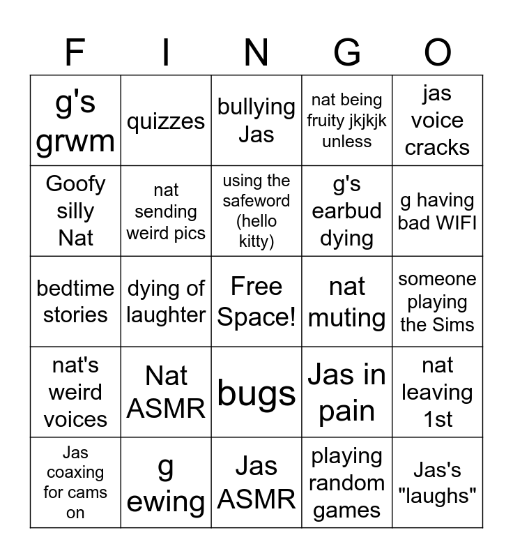 This bingo card has a free space and 27 words: Jas in pain, Jas eating, g's earbud dying, Jas ASMR, Goofy silly Nat, bullying Jas, quizzes, nat's weird voices, nat muting, nat leaving 1st, bedtime stories, nat being fruity jkjkjk unless, Jas coaxing for cams on, g ewing, g having bad WIFI, jas flirting & simping, nat sending weird pics, using the safeword (hello kitty), Nat ASMR, g's grwm, someone playing the Sims, playing random games, dying of laughter, Jas's "laughs", bugs, jas voice cracks and Extensive torturous fandom rants.