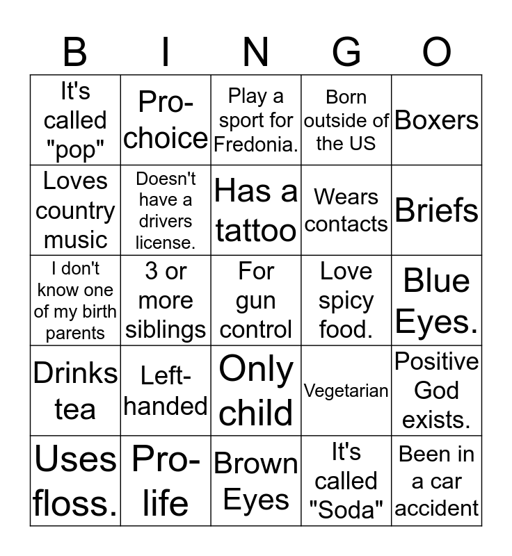 This bingo card has 25 words: Left-handed, Brown Eyes, Has a tattoo, Uses floss., Boxers, It's called "pop", Loves country music, Pro-choice, Love spicy food., Only child, Wears contacts, I don't know one of my birth parents, Vegetarian, Positive God exists., Doesn't have a drivers license., Been in a car accident, Blue Eyes., Play a sport for Fredonia., Briefs, 3 or more siblings, For gun control, Pro-life, Drinks tea, Born outside of the US and It's called "Soda".