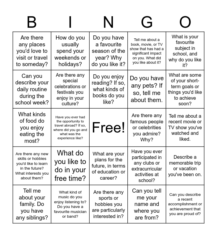 This bingo card has a free space and 25 words: What do you like to do in your free time?, Are there any sports or hobbies you are particularly interested in?, Do you enjoy reading? If so, what kinds of books do you like?, Tell me about your family. Do you have any siblings?, What is your favourite subject in school, and why do you like it?, Are there any places you'd love to visit or travel to someday?, Can you describe your daily routine during the school week?, How do you usually spend your weekends or holidays?, Are there any famous people or celebrities you admire? Why?, What are your plans for the future, in terms of education or career?, Do you have any pets? If so, tell me about them., What kinds of food do you enjoy eating the most?, Have you ever participated in any clubs or extracurricular activities at school?, Describe a memorable trip or vacation you've been on., Are there any special celebrations or festivals you enjoy in your culture?, How do you usually keep in touch with your friends and family?, Tell me about a recent movie or TV show you've watched and liked., Do you have a favourite season of the year? Why do you like it?, What are some of your short-term goals or things you'd like to achieve soon?, Have you ever had the opportunity to travel abroad? If so, where did you go and what was the experience like?, Can you describe a recent accomplishment or achievement that you are proud of?, What kind of music do you enjoy listening to? Do you have a favourite musician or band?, Are there any new skills or hobbies you'd like to learn in the future? What interests you about them?, Tell me about a book, movie, or TV show that has had a significant impact on you. What did you like about it? and Can you tell me your name and where you are from?.
