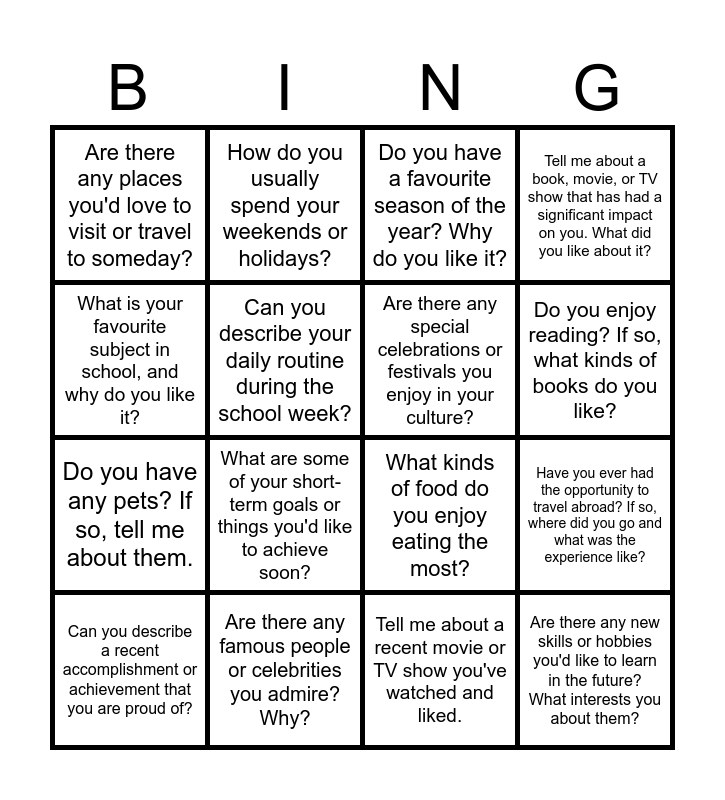 This bingo card has 25 words: What do you like to do in your free time?, Are there any sports or hobbies you are particularly interested in?, Do you enjoy reading? If so, what kinds of books do you like?, Tell me about your family. Do you have any siblings?, What is your favourite subject in school, and why do you like it?, Are there any places you'd love to visit or travel to someday?, Can you describe your daily routine during the school week?, How do you usually spend your weekends or holidays?, Are there any famous people or celebrities you admire? Why?, What are your plans for the future, in terms of education or career?, Do you have any pets? If so, tell me about them., What kinds of food do you enjoy eating the most?, Have you ever participated in any clubs or extracurricular activities at school?, Describe a memorable trip or vacation you've been on., Are there any special celebrations or festivals you enjoy in your culture?, How do you usually keep in touch with your friends and family?, Tell me about a recent movie or TV show you've watched and liked., Do you have a favourite season of the year? Why do you like it?, What are some of your short-term goals or things you'd like to achieve soon?, Have you ever had the opportunity to travel abroad? If so, where did you go and what was the experience like?, Can you describe a recent accomplishment or achievement that you are proud of?, What kind of music do you enjoy listening to? Do you have a favourite musician or band?, Are there any new skills or hobbies you'd like to learn in the future? What interests you about them?, Tell me about a book, movie, or TV show that has had a significant impact on you. What did you like about it? and Can you tell me your name and where you are from?.