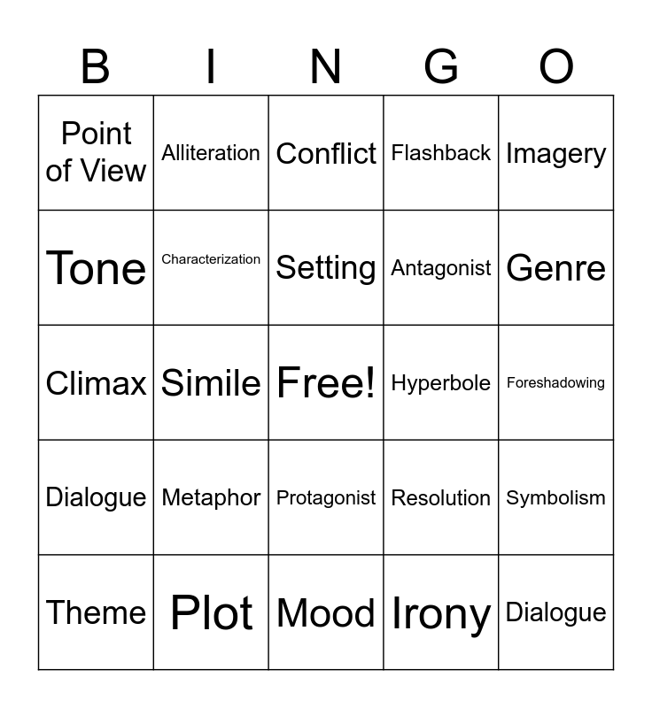This bingo card has a free space and 24 words: Metaphor, Plot, Setting, Theme, Imagery, Point of View, Tone, Alliteration, Hyperbole, Protagonist, Antagonist, Climax, Resolution, Symbolism, Characterization, Irony, Foreshadowing, Conflict, Genre, Simile, Dialogue, Dialogue, Flashback and Mood.