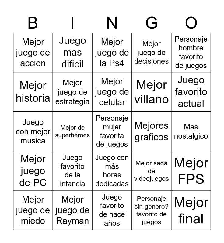 This bingo card has 25 words: Juego favorito de la infancia, Juego favorito de hace años, Mejor juego de celular, Mejor juego de miedo, Personaje hombre favorito de juegos, Mejor juego de accion, Mejor historia, Juego mas dificil, Mejores graficos, Juego con más horas dedicadas, Mejor villano, Juego con mejor musica, Mejor saga de videojuegos, Mejor FPS, Mejor juego de estrategia, Mejor final, Mas nostalgico, Mejor juego de la Ps4, Juego favorito actual, Mejor de superhéroes, Personaje mujer favorita de juegos, Mejor juego de Rayman, Mejor juego de PC, Mejor juego de decisiones and Personaje sin genero? favorito de juegos.