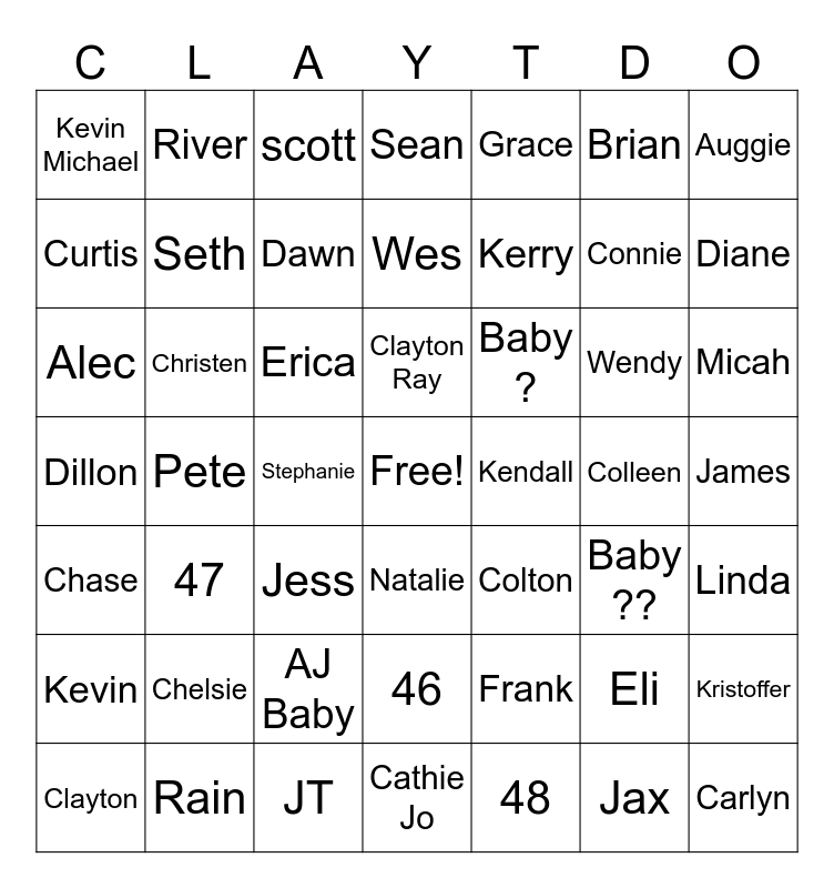 This bingo card has a free space and 48 words: Frank, Connie, Cathie Jo, Pete, Erica, James, River, Rain, Brian, Natalie, Auggie, Sean, Wendy, Baby ?, Kevin, Colleen, Curtis, Diane, Eli, Grace, Kerry, Stephanie, Kevin Michael, Seth, Kristoffer, Dawn, Micah, Clayton, Clayton Ray, Christen, Jax, Kendall, Linda, Chelsie, Dillon, Colton, Baby ??, Alec, Jess, AJ Baby, Chase, Carlyn, scott, JT, Wes, 46, 47 and 48.