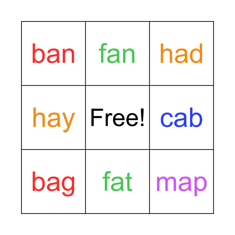 This bingo card has a free space and 24 words: bat, cat, fat, ham, map, ban, cab, fan, hat, mat, bar, car, has, pan, bag, cap, far, had, ram, bam, van, tag, hay and rat.