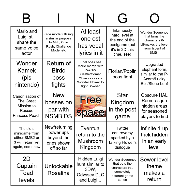 This bingo card has a free space and 24 words: New/returning power ups beyond the ones shown off so far, Unlockable Rosalina, Final boss has Mario merge with Peach's Castle/Comet Observatory via Wonder Flower to fight Bowser, 2D Captain Toad levels, Wonder Sequence that turns the characters 8-bit/makes the level reminiscent of SMB1, Mario and Luigi still share the same voice actor, Wonder Kamek (pls nintendo), Side mode fulfilling a similar purpose to MvL, Coin Rush, Challenge Mode, etc, Star Kingdom in the post game, Eventual return to the Mushroom Kingdom, Florian/Poplin boss fight, Canonisation of The Great Mission to Rescue Princess Peach, Twitter controversy sparked by a Talking Flower's dialogue, Infinite 1-up trick hidden in an early level, Return of Birdo boss fights, Wonder Sequence that puts the characters in a completely different game series, Obscure HAL Room-esque hidden areas for seasoned players to find, At least one ost has vocal lyrics in it, Upgraded Elephant form, similar to the P-Acorn/Lucky Bell/Stone Leaf, New bosses on par with NSMB DS, Sewer level theme makes a return, The slots minigame from either SMB2 or 3 will return yet again, somehow, Infamously hard level at the end of the postgame (but it's in 2D this time, see) and Hidden Luigi hunt similar to 3DW, Odyssey DLC and Luigi U.