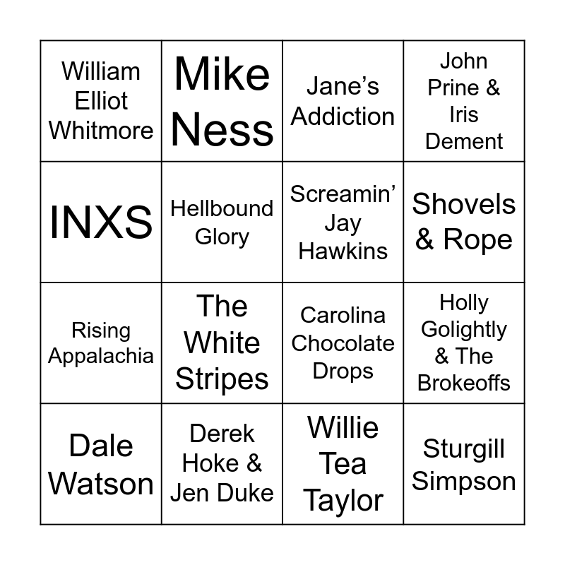 This bingo card has 22 words: Derek Hoke & Jen Duke, Johnny Paycheck, Mike Ness, The Good Luck Thrift Store Outfit, Hellbound Glory, Screamin’ Jay Hawkins, William Elliot Whitmore, Jane’s Addiction, Carolina Chocolate Drops, Sturgill Simpson, Rising Appalachia, John Prine & Iris Dement, Olds Sleeper, The Cramps, Willie Tea Taylor, Soda Gardocki, Holly Golightly & The Brokeoffs, Dale Watson, The White Stripes, INXS, Shovels & Rope and Gogol Bordello.