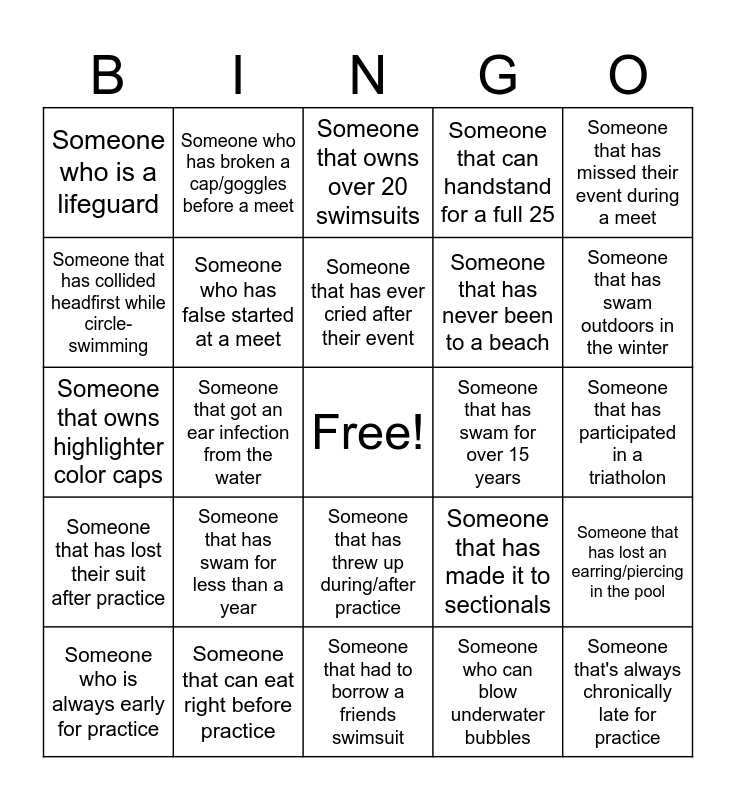 This bingo card has a free space and 24 words: Someone that has swam for less than a year, Someone that can eat right before practice, Someone that has ever cried after their event, Someone who is always early for practice, Someone that has missed their event during a meet, Someone who is a lifeguard, Someone that has collided headfirst while circle-swimming, Someone who has broken a cap/goggles before a meet, Someone that has swam for over 15 years, Someone that has threw up during/after practice, Someone that has never been to a beach, Someone that owns highlighter color caps, Someone that has made it to sectionals, Someone that has lost an earring/piercing in the pool, Someone who has false started at a meet, Someone who can blow underwater bubbles, Someone that has participated in a triatholon, Someone that owns over 20 swimsuits, Someone that has swam outdoors in the winter, Someone that got an ear infection from the water, Someone that's always chronically late for practice, Someone that has lost their suit after practice, Someone that can handstand for a full 25 and Someone that had to borrow a friends swimsuit.