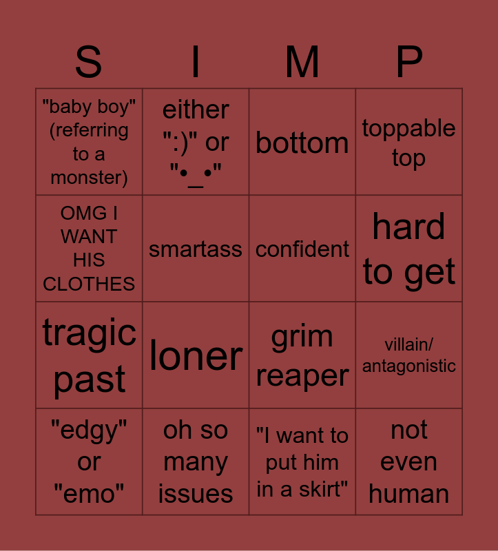 This bingo card has 16 words: "edgy" or "emo", oh so many issues, bottom, toppable top, OMG I WANT HIS CLOTHES, either ":)" or "•_•", grim reaper, villain/ antagonistic, "baby boy" (referring to a monster), smartass, "I want to put him in a skirt", hard to get, tragic past, loner, confident and not even human.