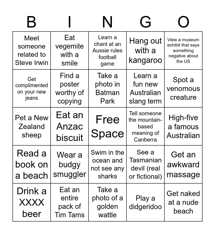 This bingo card has a free space and 24 words: Wear a budgy smuggler, Eat an entire pack of Tim Tams, Take a photo in Batman Park, Drink a XXXX beer, View a museum exhibit that says something negative about the US, Meet someone related to Steve Irwin, Get complimented on your new jeans, Eat vegemite with a smile, Tell someone the mountain-based meaning of Canberra, Swim in the ocean and not see any sharks, Learn a fun new Australian slang term, Pet a New Zealand sheep, See a Tasmanian devil (real or fictional), Get an awkward massage, Find a poster worthy of copying, Play a didgeridoo, High-five a famous Australian, Learn a chant at an Aussie rules football game, Spot a venomous creature, Eat an Anzac biscuit, Get naked at a nude beach, Read a book on a beach, Hang out with a kangaroo and Take a photo of a golden wattle.