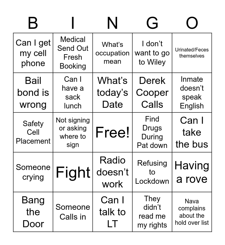 This bingo card has a free space and 34 words: My Pin Doesn’t Work, They didn’t read me my rights, What’s my bail, Call in a combative, Someone crying, Can I have a sack lunch, Urinated/Feces themselves, Bang the Door, Medical Send Out Fresh Booking, Refusing to Dress out, What’s today’s Date, What’s occupation mean, The money machine is broken, When’s my court date, Find Drugs During Pat down, Inmate doesn’t speak English, Someone Calls in, Safety Cell Placement, Fight, Refusing to Lockdown, Radio doesn’t work, Medical Transport, Can I get my cell phone, Can I take the bus, Can I talk to LT, Nava complains about the hold over list, I don’t want to go to Wiley, Turley complains at briefing, Derek Cooper Calls, Bail bond is wrong, Lt spits in the trash can, Not signing or asking where to sign, Having a rove and 3Scheduled Short.