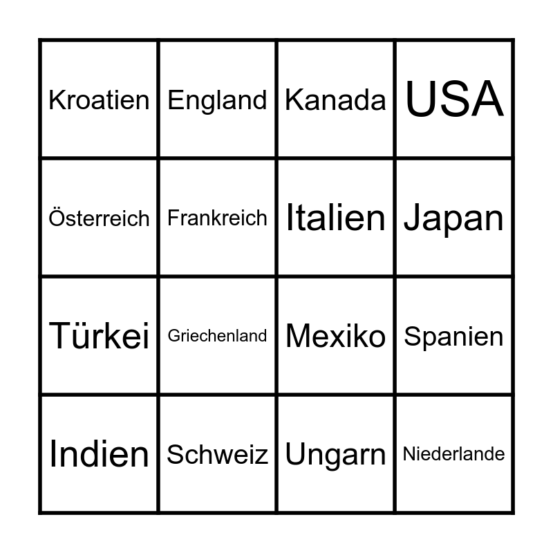 This bingo card has 16 words: Indien, Schweiz, Kanada, USA, Österreich, England, Mexiko, Spanien, Kroatien, Frankreich, Ungarn, Japan, Türkei, Griechenland, Italien and Niederlande.