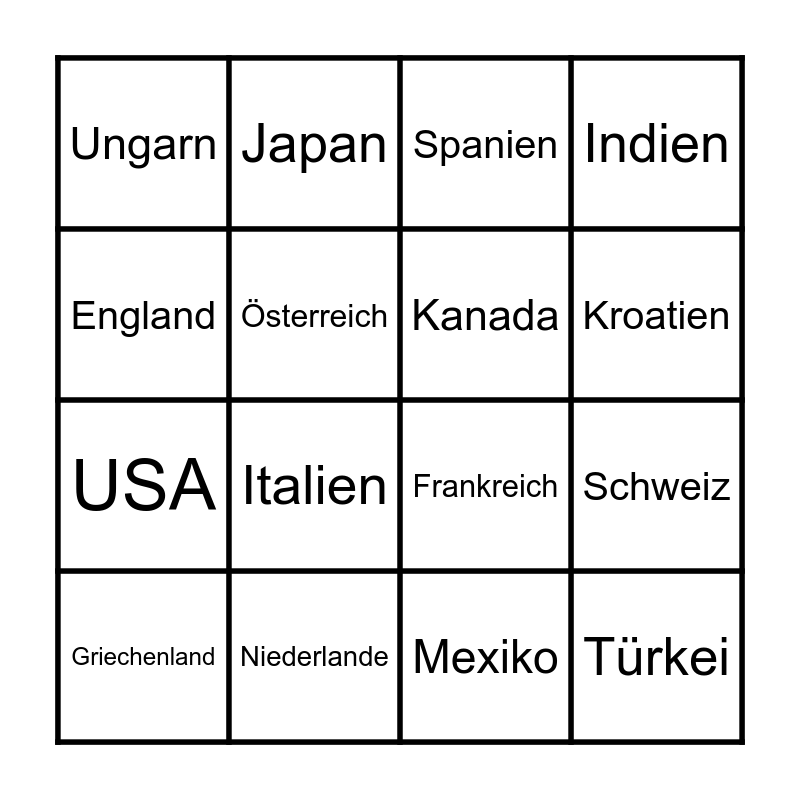 This bingo card has 16 words: Niederlande, Schweiz, Spanien, Ungarn, USA, Japan, Frankreich, Mexiko, England, Österreich, Griechenland, Indien, Italien, Kroatien, Kanada and Türkei.