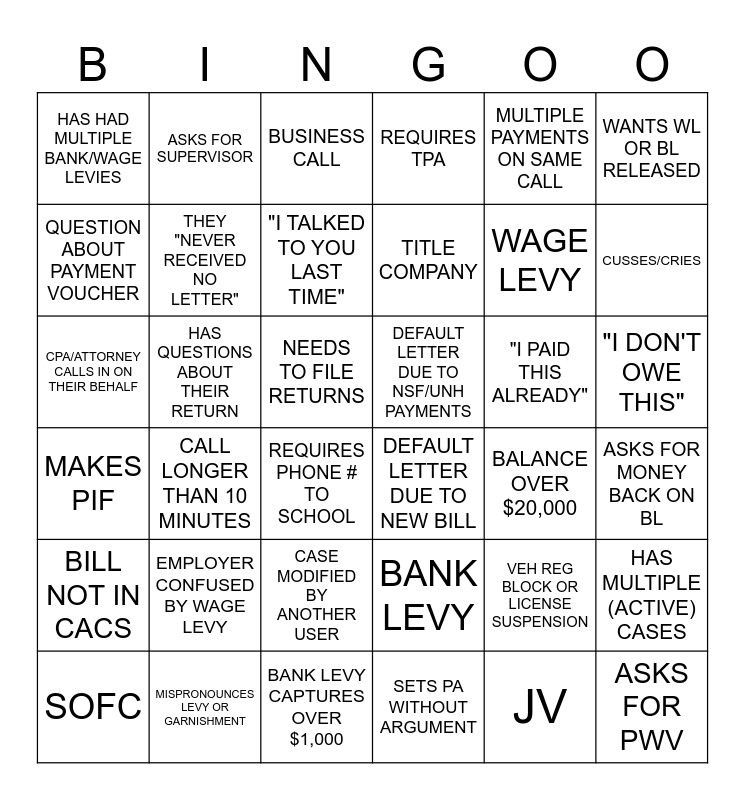 This bingo card has 36 words: BANK LEVY, CASE MODIFIED BY ANOTHER USER, SETS PA WITHOUT ARGUMENT, QUESTION ABOUT PAYMENT VOUCHER, MAKES PIF, DEFAULT LETTER DUE TO NSF/UNH PAYMENTS, THEY "NEVER RECEIVED NO LETTER", BANK LEVY CAPTURES OVER $1,000, MULTIPLE PAYMENTS ON SAME CALL, VEH REG BLOCK OR LICENSE SUSPENSION, CUSSES/CRIES, REQUIRES TPA, HAS MULTIPLE (ACTIVE) CASES, HAS QUESTIONS ABOUT THEIR RETURN, TITLE COMPANY, HAS HAD MULTIPLE BANK/WAGE LEVIES, BILL NOT IN CACS, "I PAID THIS ALREADY", CPA/ATTORNEY CALLS IN ON THEIR BEHALF, BUSINESS CALL, NEEDS TO FILE RETURNS, CALL LONGER THAN 10 MINUTES, DEFAULT LETTER DUE TO NEW BILL, REQUIRES PHONE # TO SCHOOL, BALANCE OVER $20,000, ASKS FOR SUPERVISOR, WAGE LEVY, MISPRONOUNCES LEVY OR GARNISHMENT, "I TALKED TO YOU LAST TIME", WANTS WL OR BL RELEASED, ASKS FOR PWV, SOFC, ASKS FOR MONEY BACK ON BL, "I DON'T OWE THIS", EMPLOYER CONFUSED BY WAGE LEVY and JV.