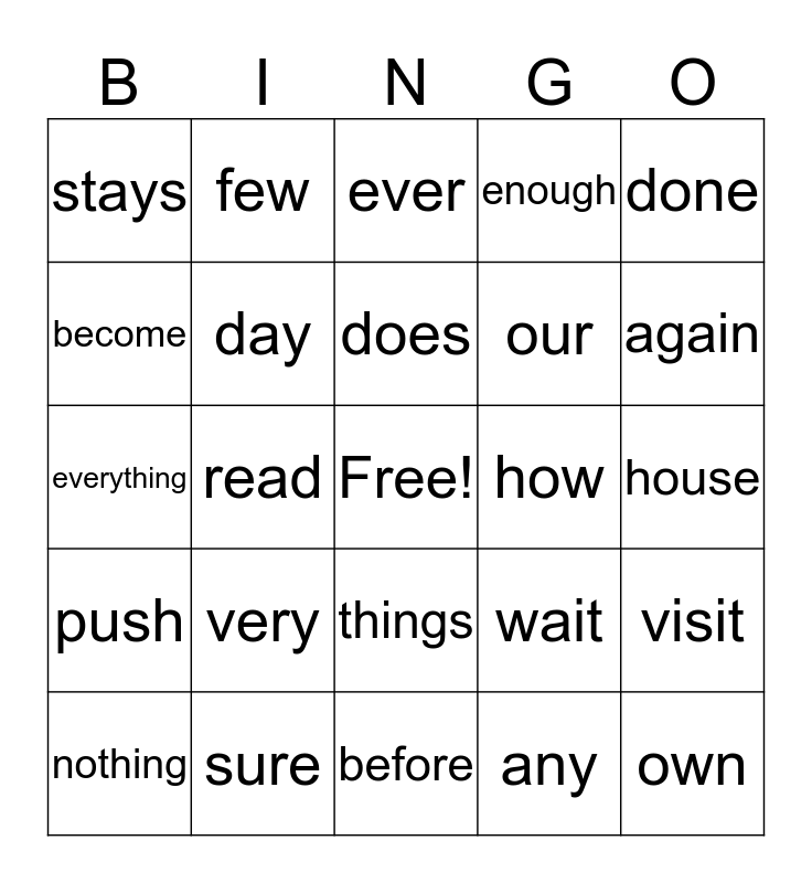 This bingo card has a free space and 24 words: very, sure, does, nothing, done, stays, become, few, how, things, our, everything, wait, visit, day, any, house, ever, again, read, own, push, enough and before.