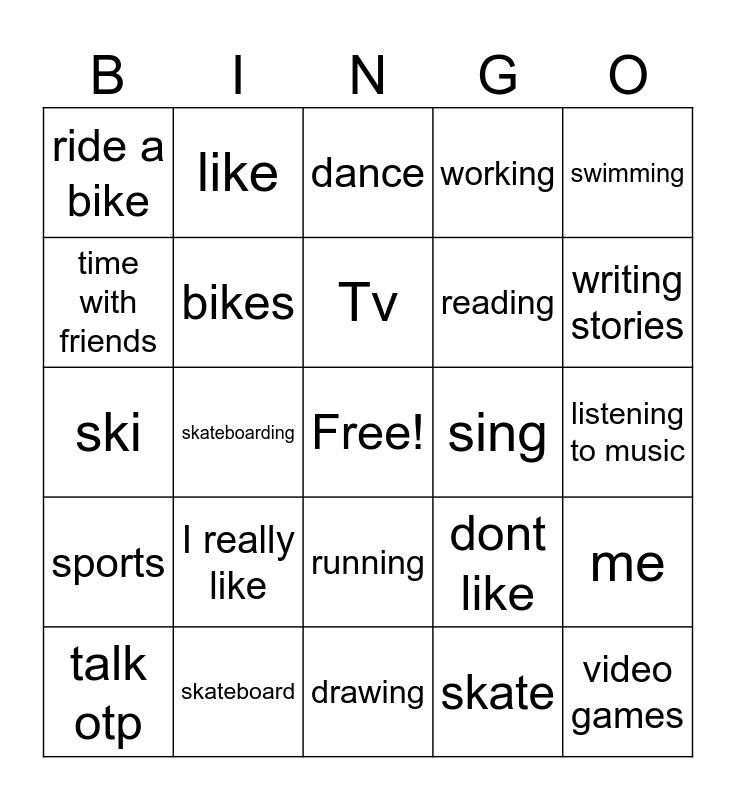 This bingo card has a free space and 24 words: I really like, skateboard, Tv, talk otp, swimming, ride a bike, time with friends, like, sing, running, reading, ski, dont like, me, bikes, skate, listening to music, dance, writing stories, skateboarding, video games, sports, working and drawing.