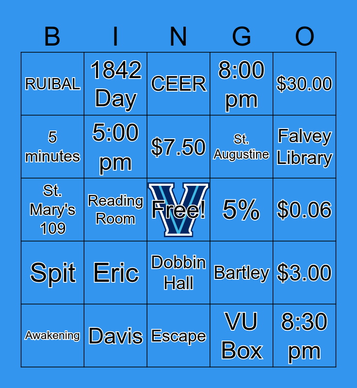 This bingo card has a free space and 24 words: Eric, Davis, $7.50, Awakening, $30.00, RUIBAL, 5 minutes, 1842 Day, 5%, Dobbin Hall, St. Augustine, St. Mary's 109, Bartley, $3.00, 5:00 pm, VU Box, $0.06, CEER, Falvey Library, Reading Room, 8:30 pm, Spit, 8:00 pm and Escape.
