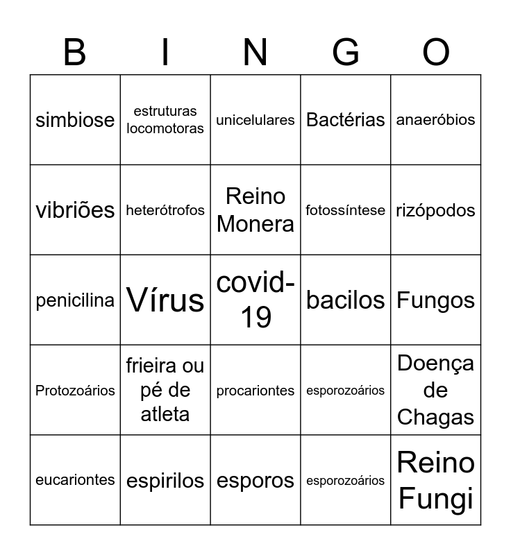 This bingo card has a free space and 39 words: coração, multicelulares, autótrofos, heterótrofos, eucariontes, procariontes, Reino Monera, aeróbios, anaeróbios, Protozoários, Vírus, Bactérias, Reino Fungi, Fungos, bacilos, frieira ou pé de atleta, Reino Protista, simbiose, cocos, esporozoários, vibriões, esporos, fotossíntese, rizópodos, Reino Animal, flagelados, Amebíase, leveduras, ciliados, estruturas locomotoras, cianobactérias ou algas azuis, algas pirofíceas, unicelulares, espirilos, esporozoários, Reino Vegetal, Doença de Chagas, penicilina and formato do organismo.