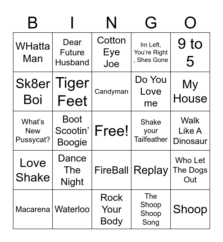 This bingo card has a free space and 58 words: Take A Chance On Me, Waterloo, Go West, Love Shake, The Shoop Shoop Song, Nutbush City Limits, Tiger Feet, Hot Stuff, Do You Love me, Everybody Get Up, Im Left, You’re Right , Shes Gone, Rock The Boat, Na Na Hey Hey, I Gotta Feeling, Hey Ya!, WHatta Man, Shoop, 9 to 5, She Bangs, Candyman, Shake your Tailfeather, Cotton Eye Joe, Macarena, Who Let The Dogs Out, Some Days You Gotta Dance, Walk Like A Dinosaur, ABC, I Will Always Love You, My House, Can’t Feel My Face, Boombastic, One Little Slip, Burning Down The House, Hey Mickey You’re So FIne, Footloose, Gettin’ Jiggy wit It, It’s Tricky, Boot Scootin’ Boogie, What’s New Pussycat?, Shake Senora, Dance The Night, Rich Girl, Replay, Diva, The Boy is Mine, The Sweet Escape, Want U BAck, FireBall, Rock Your Body, I like It, I love It, Tusa, Single Soon, Bang Bang, Blank Space, Dear Future Husband, Baby, Sk8er Boi and Confident.