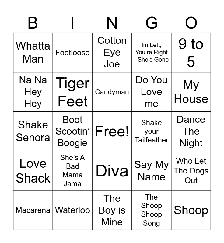 This bingo card has a free space and 61 words: Take A Chance On Me, Waterloo, Go West, Love Shack, The Shoop Shoop Song, Nutbush City Limits, Tiger Feet, Hot Stuff, Do You Love me, Everybody Get Up, Im Left, You’re Right , She's Gone, Rock The Boat, Na Na Hey Hey, I Gotta Feeling, Hey Ya!, Whatta Man, Shoop, 9 to 5, She Bangs, Candyman, Shake your Tailfeather, Cotton Eye Joe, Macarena, Who Let The Dogs Out, Some Days You Gotta Dance, Walk Like A Dinosaur, ABC, I Will Always Love You, My House, Can’t Feel My Face, Boombastic, One Little Slip, Burning Down The House, Hey Mickey You’re So FIne, Footloose, Gettin’ Jiggy wit It, It’s Tricky, Boot Scootin’ Boogie, What’s New Pussycat?, Shake Senora, I Want CAndy, She’s A Bad Mama Jama, Dance The Night, Rich Girl, Say My Name, Toxic, Survivor, Gasolina, Replay, Diva, The Boy is Mine, The Sweet Escape, Want U BAck, FireBall, Rock Your Body, I like It, I love It, Tusa, Single Soon, Bang Bang, Blank Space and Confident.