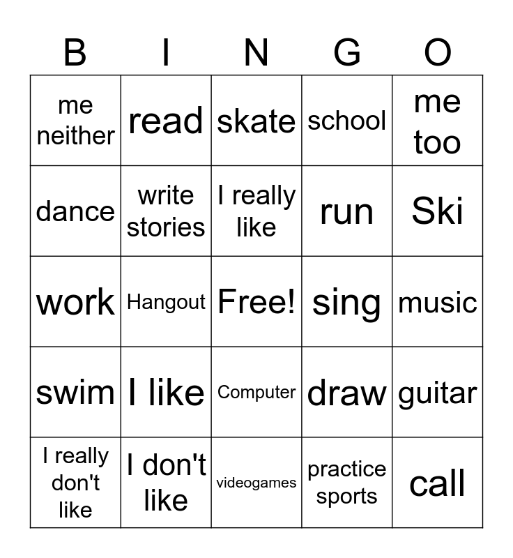 This bingo card has a free space and 24 words: I like, I don't like, I really like, I really don't like, me too, me neither, dance, read, sing, Computer, run, work, draw, guitar, write stories, practice sports, music, skate, Ski, Hangout, call, swim, school and videogames.
