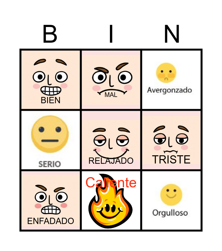 This bingo card has 22 images, a free space and 9 words: FELIZ, ASUSTADO, MAL, CONTENTO, TRISTE, ENFADADO, BIEN, Caliente and Frío.