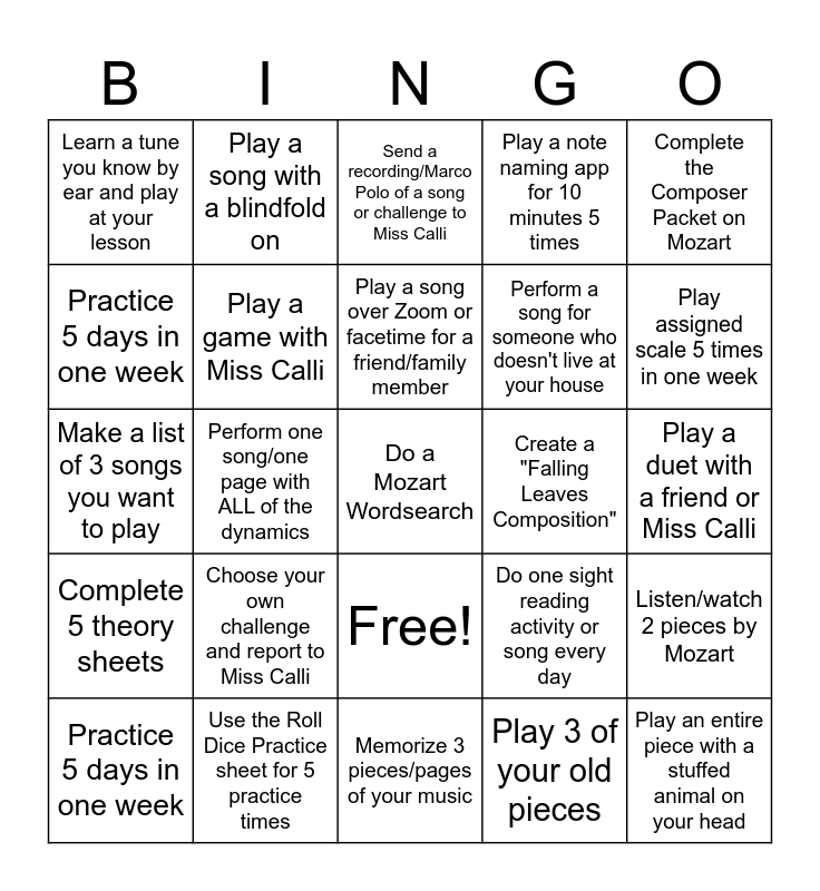 This bingo card has 26 words: Free!, Play 3 of your old pieces, Play a song over Zoom or facetime for a friend/family member, Use the Roll Dice Practice sheet for 5 practice times, Complete the Composer Packet on Mozart, Learn a tune you know by ear and play at your lesson, Practice 5 days in one week, Play a song with a blindfold on, Play a duet with a friend or Miss Calli, Do one sight reading activity or song every day, Perform a song for someone who doesn't live at your house, Make a list of 3 songs you want to play, Listen/watch 2 pieces by Mozart, Practice 5 days in one week, Perform one song/one page with ALL of the dynamics, Play 3 different songs with round hands and a straight back, Play a note naming app for 10 minutes 5 times, Complete 5 theory sheets, Send a recording/Marco Polo of a song or challenge to Miss Calli, Do a Mozart Wordsearch, Play assigned scale 5 times in one week, Memorize 3 pieces/pages of your music, Create a "Falling Leaves Composition", Choose your own challenge and report to Miss Calli, Play a game with Miss Calli and Play an entire piece with a stuffed animal on your head.