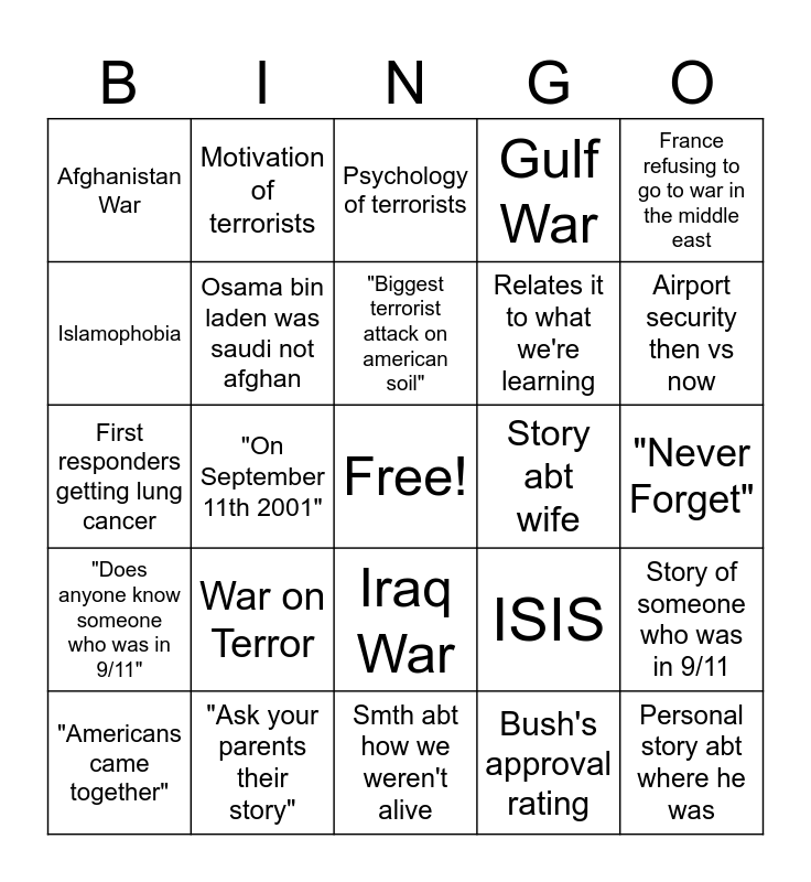 This bingo card has a free space and 24 words: War on Terror, "Ask your parents their story", "Biggest terrorist attack on american soil", "Americans came together", France refusing to go to war in the middle east, Afghanistan War, Islamophobia, Motivation of terrorists, Story abt wife, Iraq War, Relates it to what we're learning, First responders getting lung cancer, ISIS, Story of someone who was in 9/11, Osama bin laden was saudi not afghan, Bush's approval rating, "Never Forget", Psychology of terrorists, Airport security then vs now, "On September 11th 2001", Personal story abt where he was, "Does anyone know someone who was in 9/11", Gulf War and Smth abt how we weren't alive.