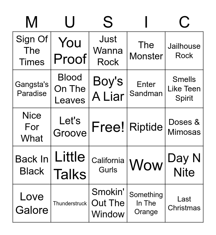 This bingo card has a free space and 77 words: Billie Jean, I Gotta Feeling, Just Wanna Rock, How Will I Know?, Brown Eyed Gril, Toxic, What Makes You Beautiful, Love story, Baby, Super Bass, Cruel Summer, Kill Bill, Boy's A Liar, Gangsta's Paradise, Purple Rain, Let's Groove, Careless Whisper, Last Christmas, Paint It, Black, Jailhouse Rock, Everything I am, Nice For What, Blood On The Leaves, You Proof, The Monster, Love You Like A Love Song, Bring Me To Life, On The Floor, Sandstorm, This Bar, Total Eclipse Of The Heart, The Sweet Escape, The Dirt, Wow, Smells Like Teen Spirit, Enter Sandman, Jump, Leave The Door Open, Doses & Mimosas, Something In The Orange, Lost, Thinkin Bout You, Sweet Child O' Mine, All Summer Long, Everywhere, One Dance, Love Galore, Sign Of The Times, Rather Be, Margaritaville, Everytime We Touch, California Gurls, Animal, Disturbia, Stereo Hearts, Paradise, Royals, Clarity, Still Into You, Rude, Little Talks, Some Nights, Hey, Soul Sister, Good Girls Go Bad, Here's To Never Growing Up, It Wasn't Me, Hollaback Girl, Riptide, Gold Digger, Ms. Jackson, Complicated, Day N Nite, Back In Black, Thunderstruck, Vienna, Smokin' Out The Window and Love Me Do.