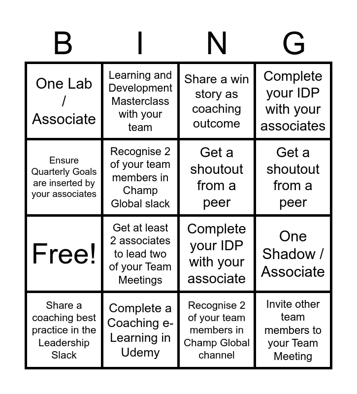 This bingo card has 20 words: One Shadow / Associate, Get a shoutout / recognition from your IC, Share a win story as coaching outcome, Leadership Calibration Session, Share a coaching best practice in the Leadership Slack, Ensure Quarterly Goals are inserted by your associates, Complete a Coaching e-Learning in Udemy, One Lab / Associate, Free!, Learning and Development Masterclass with your team, Get at least 2 associates to lead two of your Team Meetings, Complete your IDP with your associate, Recognise 2 of your team members in Champ Global slack, Invite other team members to your Team Meeting, Get a shoutout from a peer, Repurpose one of your Team Meetings to reinforce importance of a coaching culture, Get a shoutout from a peer, Complete your IDP with your associates, Recognise 2 of your team members in Champ Global channel and Invite other team members to take part of your team meeting.