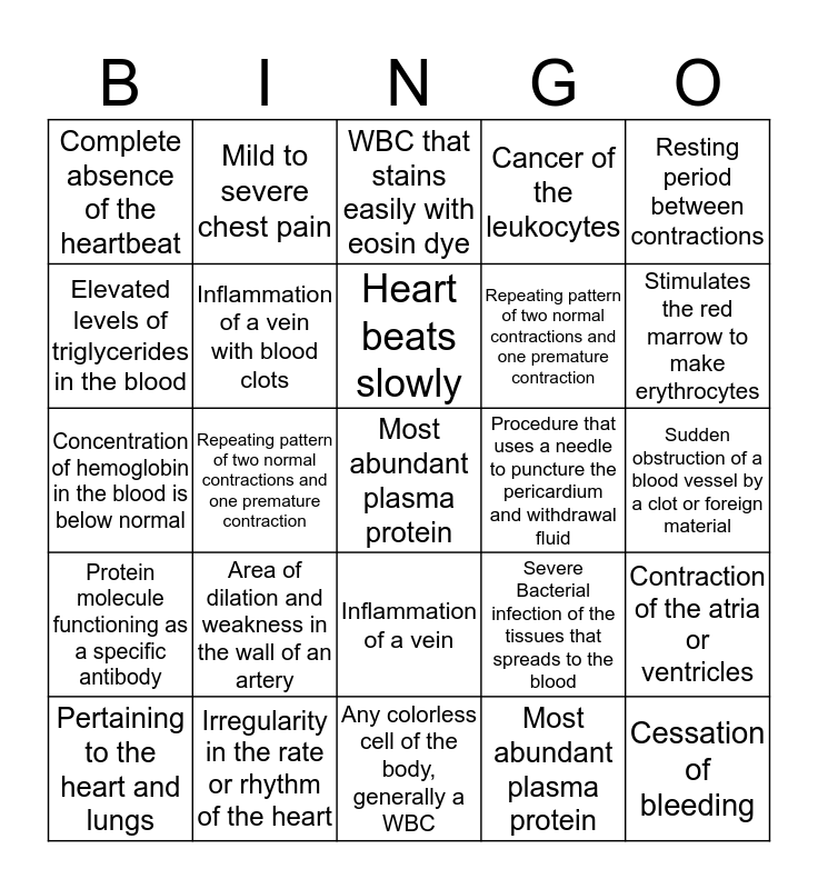 This bingo card has a free space and 24 words: Area of dilation and weakness in the wall of an artery, Irregularity in the rate or rhythm of the heart, Heart beats slowly, Pertaining to the heart and lungs, Resting period between contractions, Complete absence of the heartbeat, Elevated levels of triglycerides in the blood, Mild to severe chest pain, Procedure that uses a needle to puncture the pericardium and withdrawal fluid, Inflammation of a vein, Repeating pattern of two normal contractions and one premature contraction, Concentration of hemoglobin in the blood is below normal, Severe Bacterial infection of the tissues that spreads to the blood, Contraction of the atria or ventricles, Inflammation of a vein with blood clots, Most abundant plasma protein, Sudden obstruction of a blood vessel by a clot or foreign material, WBC that stains easily with eosin dye, Stimulates the red marrow to make erythrocytes, Repeating pattern of two normal contractions and one premature contraction, Cessation of bleeding, Protein molecule functioning as a specific antibody, Cancer of the leukocytes and Any colorless cell of the body, generally a WBC.