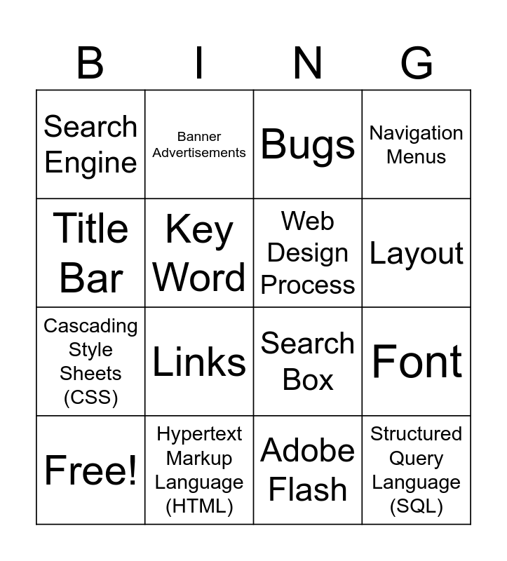 This bingo card has 23 words: Structured Query Language (SQL), WYSIWYG Editor, Layout, Really Simple Syndication (RSS), Title Bar, Search Engine, Key Word, Banner Advertisements, Free!, Extensible Markup Language (XML), Links, Cascading Style Sheets (CSS), Site Map, Advertising, Hypertext Markup Language (HTML), Search Engine Optimization (SEO), Bugs, Search Box, Web Design Process, Font, Navigation Menus, Adobe Flash and Web Host.