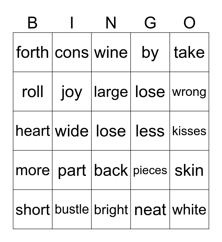 This bingo card has a free space and 69 words: win, pride, butter, never, kisses, now, joy, hugs, lose, bread, more, parcel, by, take, give, part, large, less, hustle, heart, bustle, bright, pieces, heart, early, bits, on, pros, white, off, cons, black, safe, later, sound, sooner, right, sweet, wrong, short, step, wine, neat, step, tidy, dine, back, far, loud, forth, wide, up, clear, skin, down, bone, odds, rock, ends, roll, wear, law, tear, order, little, spick, win, span and little.