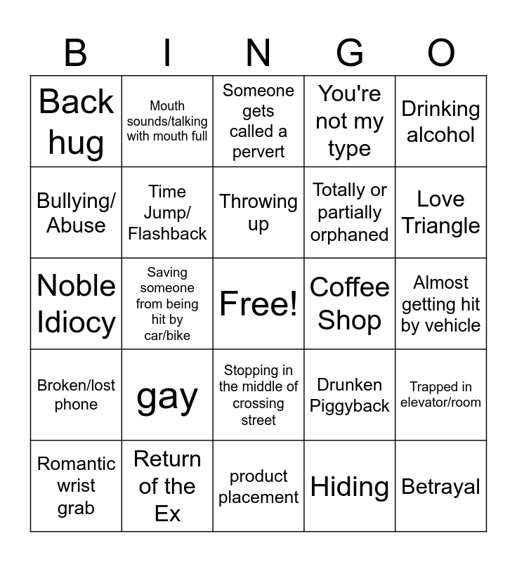 This bingo card has a free space and 51 words: childhood/previous life connections, Betrayal, Car accident, product placement, gay, music tells you how to feel, Mouth sounds/talking with mouth full, Random english speaking, Bullying/ Abuse, Rain/ snow, Time Jump/ Flashback, You're not my type, Trapped in elevator/room, Drunken Piggyback, meeting with a disapproving potential in-law, hospital, Throwing up, Coffee Shop, Drink in the face, Drinking alcohol, Saving someone from being hit by car/bike, Hiding, Back hug, Totally or partially orphaned, Slo-mo walking, wide eye kiss, Love Triangle, Traveling Abroad, Romantic wrist grab, Someone gets called a pervert, Hitting with bag/purse, Fake relationship, Amnesia, Accident prone main female lead, Shower scene, Return of the Ex, Crying while eating, Being nursed back to health (not at hospital), Ignoring call/text, too emotional to walk straight, Almost getting hit by vehicle, Broken/lost phone, Childhood trauma, Lapse in logic, Dramatic Crying, Bathroom emergency, Noble Idiocy, Perfect second Lead, Marriage proposal, Stopping in the middle of crossing street and Rooftop.