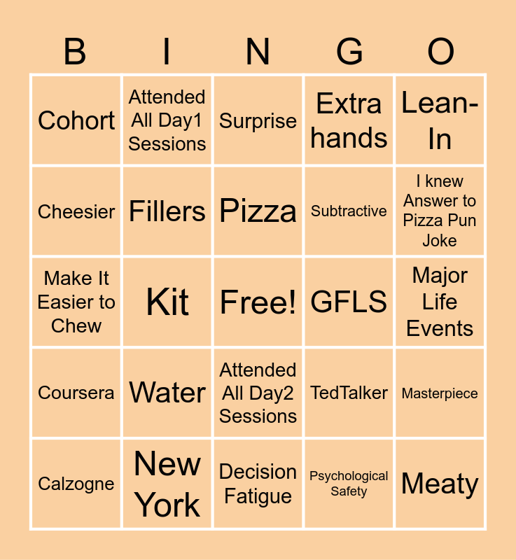 This bingo card has a free space and 24 words: Water, New York, Pizza, Calzogne, Lean-In, Cohort, Cheesier, Attended All Day1 Sessions, GFLS, Attended All Day2 Sessions, Subtractive, Make It Easier to Chew, TedTalker, Masterpiece, Fillers, Psychological Safety, Major Life Events, Surprise, I knew Answer to Pizza Pun Joke, Kit, Meaty, Coursera, Extra hands and Decision Fatigue.