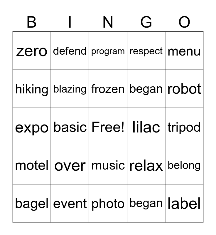 This bingo card has a free space and 24 words: over, event, frozen, bagel, menu, zero, hiking, defend, lilac, music, began, expo, relax, belong, blazing, began, tripod, program, robot, basic, label, motel, respect and photo.