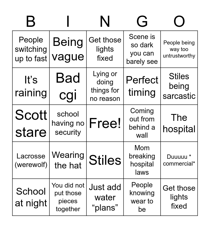 This bingo card has a free space and 26 words: Stiles, People knowing wear to be, Lying or doing things for no reason, You did not put those pieces together, People being way too untrustworthy, People switching up to fast, It’s raining, Being vague, The hospital, Mom breaking hospital laws, Perfect timing, Scott stare, Duuuuu * commercial*, School at night, school having no security, Music is played too loud, Scene is so dark you can barely see, Lacrosse (werewolf), Get those lights fixed, Get those lights fixed, Stiles being sarcastic, Just add water “plans”, Coming out from behind a wall, Wearing the hat, Bad cgi and Bad green screen.