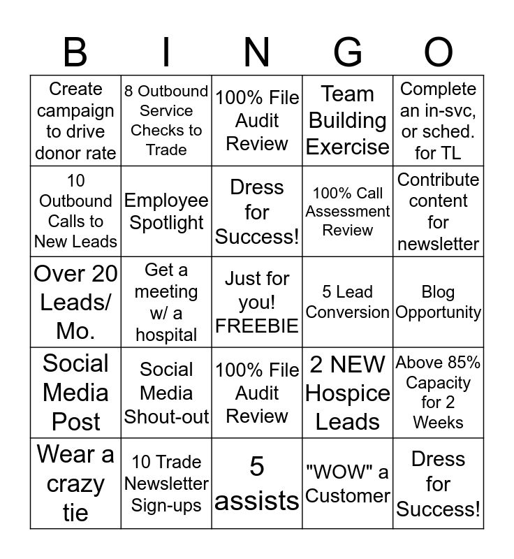 This bingo card has a free space and 24 words: Social Media Shout-out, 10 Trade Newsletter Sign-ups, Dress for Success!, Wear a crazy tie, Complete an in-svc, or sched. for TL, Create campaign to drive donor rate, 10 Outbound Calls to New Leads, 8 Outbound Service Checks to Trade, 5 Lead Conversion, 100% File Audit Review, 100% Call Assessment Review, Over 20 Leads/ Mo., 2 NEW Hospice Leads, Above 85% Capacity for 2 Weeks, Employee Spotlight, "WOW" a Customer, Blog Opportunity, 100% File Audit Review, Contribute content for newsletter, Get a meeting w/ a hospital, Dress for Success!, Social Media Post, Team Building Exercise and 5 assists.