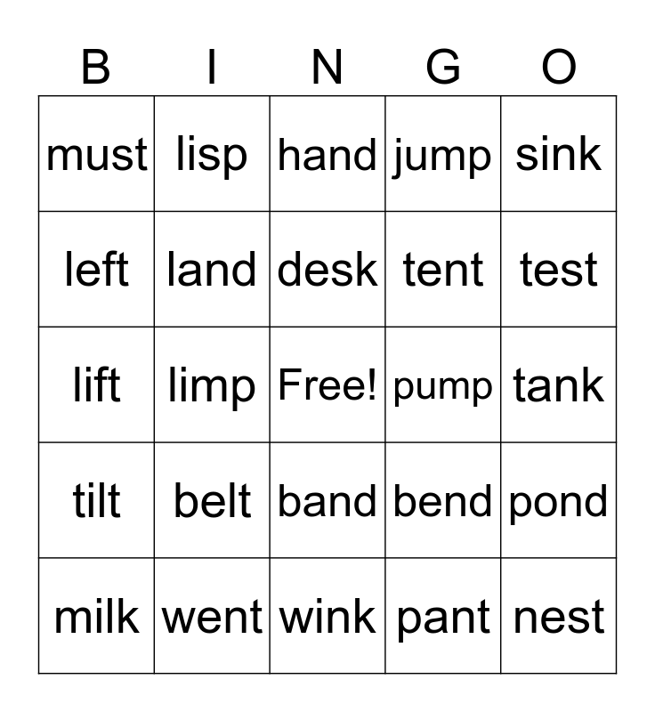 This bingo card has a free space and 24 words: belt, went, desk, milk, sink, must, left, lisp, pump, band, tent, lift, bend, pond, land, pant, tank, hand, test, limp, nest, tilt, jump and wink.