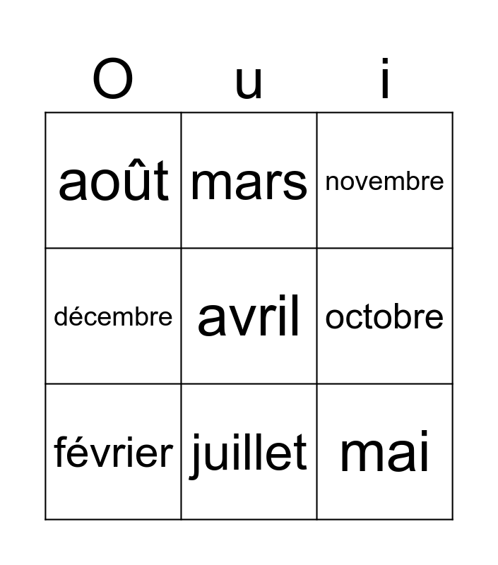 This bingo card has 14 words: La date, janvier, février, mars, décembre, avril, mai, juin, juillet, août, septembre, octobre, novembre and Les mois.