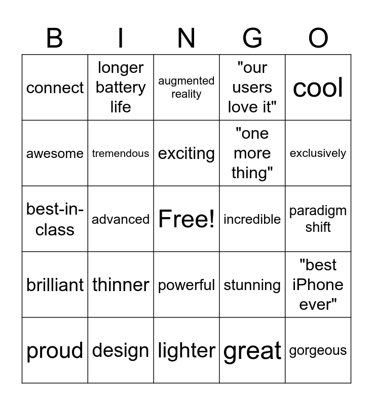 This bingo card has a free space and 48 words: amazing, gorgeous, easier, lighter, thinner, faster, longer battery life, game changer, awesome, thrilled, tremendous, "our users love it", "best iPhone ever", stunning, inspired, fun, exciting, incredible, unbelievable, cool, advanced, great, connect, "one more thing", super, exclusively, proud, magical, powerful, brilliant, passion, team, fantastic, phenomenal, design, revolutionary, synergy, paradigm shift, innovation, seamless integration, sustainability, user-centric, augmented reality, wearables, best-in-class, machine learning, responsive design and storytelling.