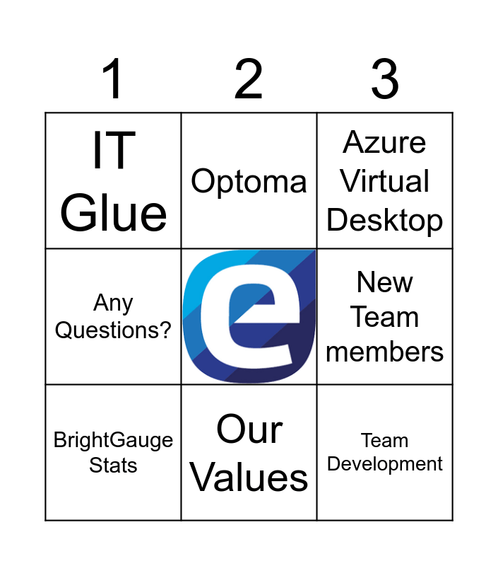 This bingo card has a free space and 8 words: New Team members, Azure Virtual Desktop, Optoma, BrightGauge Stats, IT Glue, Team Development, Any Questions? and Our Values.