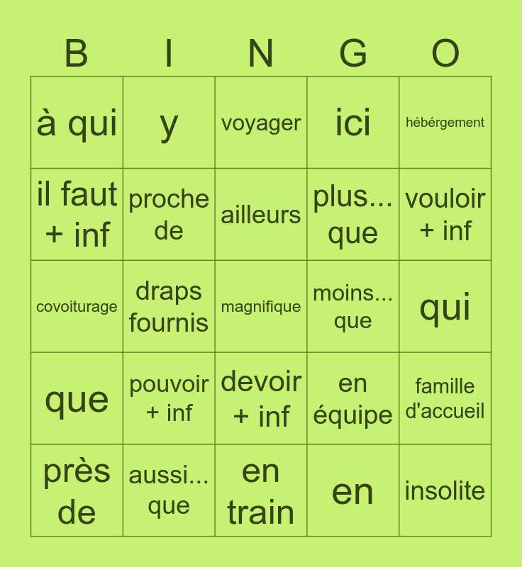 This bingo card has a free space and 24 words: pouvoir + inf, aussi... que, ailleurs, près de, hébérgement, à qui, il faut + inf, y, moins... que, devoir + inf, plus... que, covoiturage, en équipe, famille d'accueil, proche de, en, qui, voyager, vouloir + inf, draps fournis, insolite, que, ici and en train.