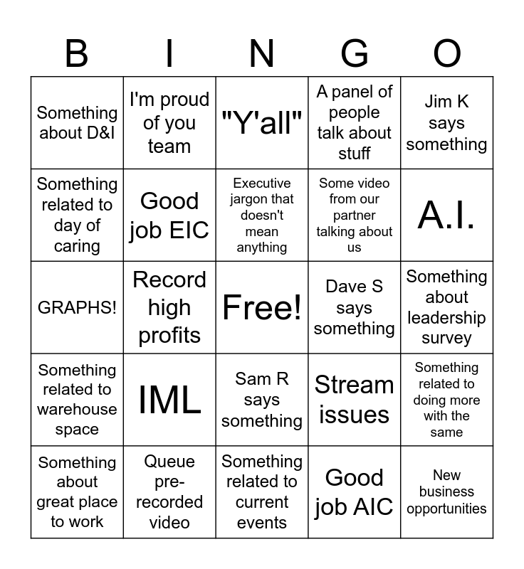 This bingo card has a free space and 24 words: IML, Queue pre-recorded video, Executive jargon that doesn't mean anything, Something about great place to work, Jim K says something, Something about D&I, Something related to day of caring, I'm proud of you team, Dave S says something, Sam R says something, Some video from our partner talking about us, GRAPHS!, Stream issues, Something related to doing more with the same, Good job EIC, Good job AIC, Something about leadership survey, "Y'all", A.I., Record high profits, New business opportunities, Something related to warehouse space, A panel of people talk about stuff and Something related to current events.